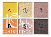 3色のヌーディカラー((2)(3)(4))をのせたあと、目尻にアクセントカラー(AまたはB)を。