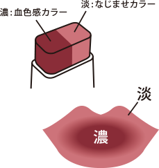 血色感カラーを内側、なじませカラーを外側になじませるだけで、自然なグラデーションリップが簡単に完成します。