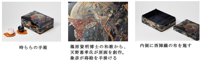 哲学者で詩人の京都大学名誉教授篠原資明博士による、「美は時を超える」をテーマとした和歌「星と露 瞳に出会う 玉響の 幾千代超えて 時らら先ら」をもとに、現代美術家天野喜孝氏が蒔絵の原画を創作。