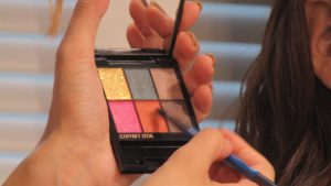 1.右上の淡いブラウンをまぶた全体に入れた後、二重に真ん中下のオレンジを入れる