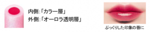 見る角度で輝きが変化する「オーロラ透明層」と自然な血色感を与える 「カラー層」の2層式。