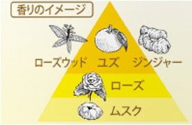 使い始めはユズのさわやかな香り、時間が経つにつれてミドルのローズ、ボトムのムスクの香りがふんわりと全身を包み込みます。