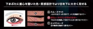 目もとの彫りを演出するマットなカラー、下まぶたを強調して目を下に大きく見せるツヤのあるカラー、目の輪郭を際立たせる影色カラーの3色をセット。