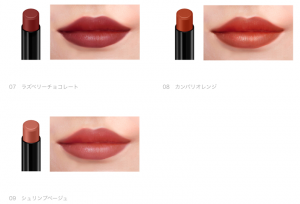 また、落ちにくいリップからも深みカラー「ラズベリーチョコレート」と、黄味系カラーの「カンパリオレンジ」、「シュリンプベージュ」が新登場。