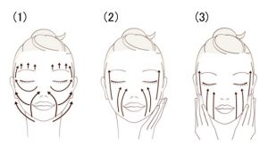 ●フェイスライン、頬、ほうれい線、目もとに沿って持ち上げるように塗布します。(各6回)(1)