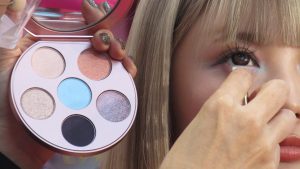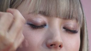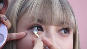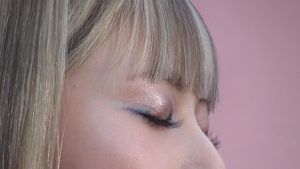 仕上げにパレット左上のホワイトピンク系のカラーを黒目の下あたりと眉下にポイント使いで入れます。