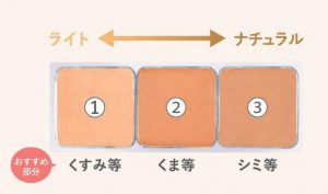 3色それぞれの単色使いで、くすみ・クマ・シミといった肌悩みをピンポイントに隠せます。