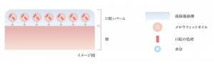 上から口紅を重ねた後、唇をすり合わせることで、呼気や唇の水分に反応して粘度を増したメロウフィットオイルが、口紅の色材を抱えながらフィット。