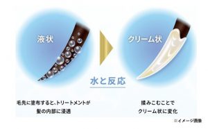 また、髪に揉みこむことで髪表面の水分と反応してテクスチャーがクリーム状に変化。