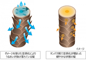 ダメージを受けた髪は、スポンジのように毛髪内部が空洞化しています。髪に元々蓄えられている成分が流失しダメージホールが発生。穴があいた状態ではいくら成分補給をしても、ため込むことができず流れ出る状態に陥ります。