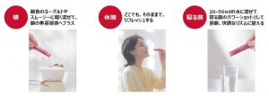 錠剤では9粒程度になってしまう成分を1袋のパウダー(顆粒)に凝縮。いつでもどこでも飲め、自由な飲み方の提案をかなえます。