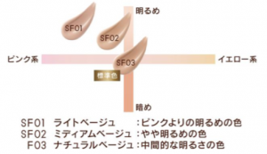 ピンクよりの明るめの色(SF01)、やや明るめの色(SF02)、中間的な明るさの色(SF03)の3色展開。